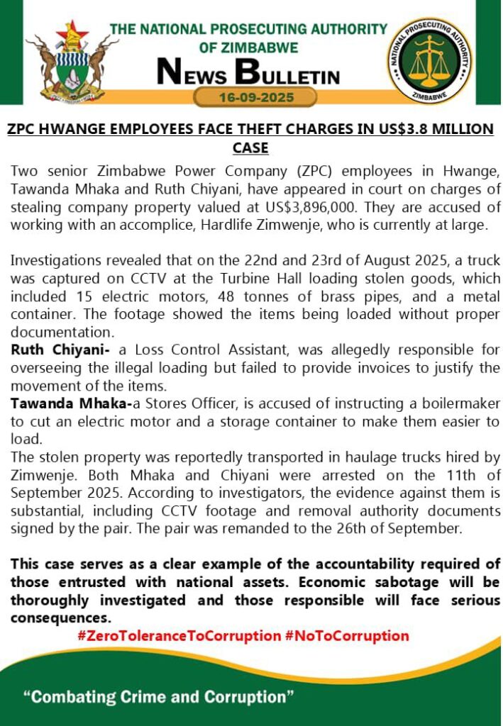 The stolen property was reportedly transported using haulage trucks hired by Zimwenje. Both Mhaka and Chiyani were arrested on September 11, with investigators citing overwhelming evidence against them, including CCTV footage and removal authority documents signed by the pair.